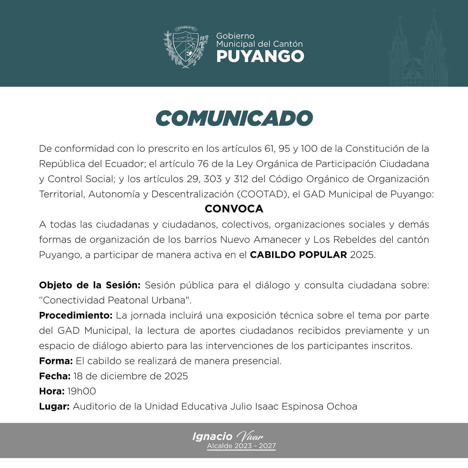 La convocatoria debe señalar: objeto, procedimiento, forma, fecha, hora y lugar del cabildo popular. La ciudadanía debe estar debidamente informada sobre el tema y tendrá, únicamente, carácter consultivo.